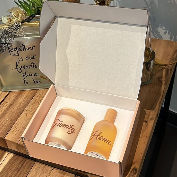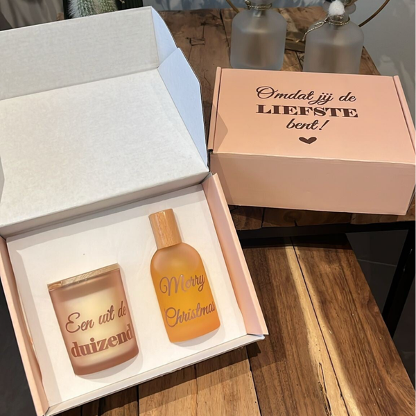 Luxegiftbox geurkaars & roomspray gevuld - frosted blush
