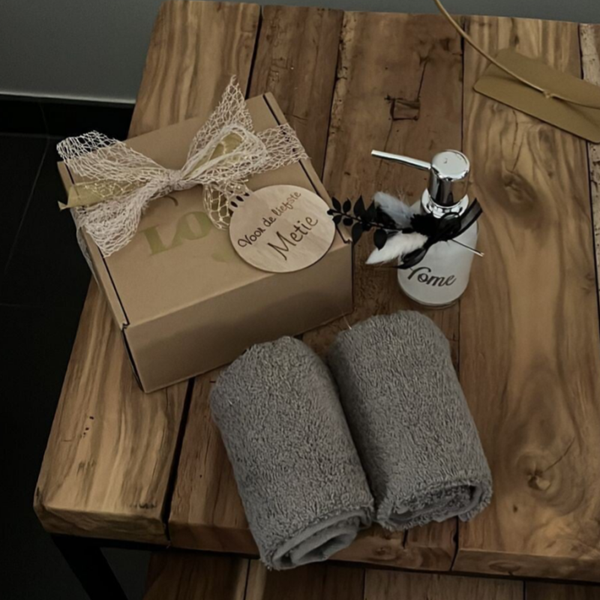 In dit leuk setje zitten 2 gastendoekjes en een zeeppompje, ideaal geschenk om in je toilet te plaatsen.