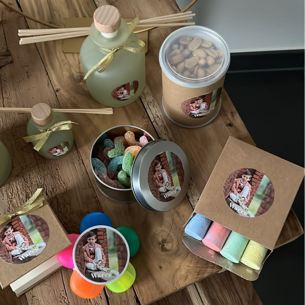 De stickers dien je apart te bestellen in de map stickers, diameter 6 cm.