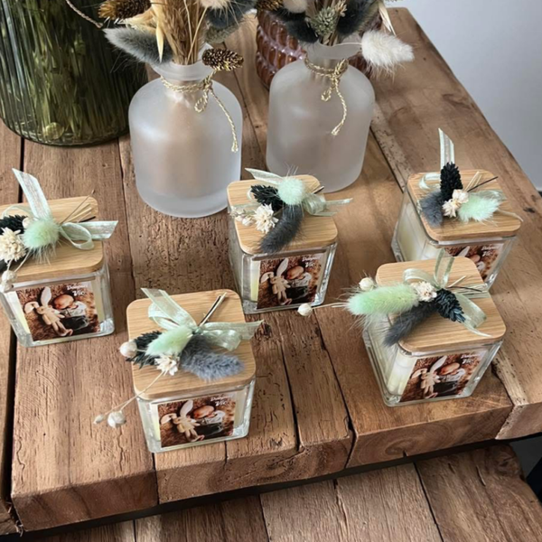 5 luxe t-lichtjes vanille met houten deksels en foto, eventueel een naam en datum kan op de foto geplaatst worden.