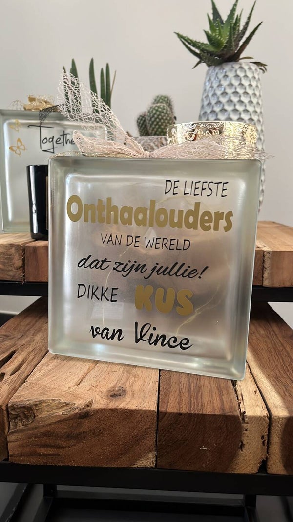 De glasblok is 19 op 19 cm groot, inclusief lichtjes.