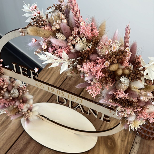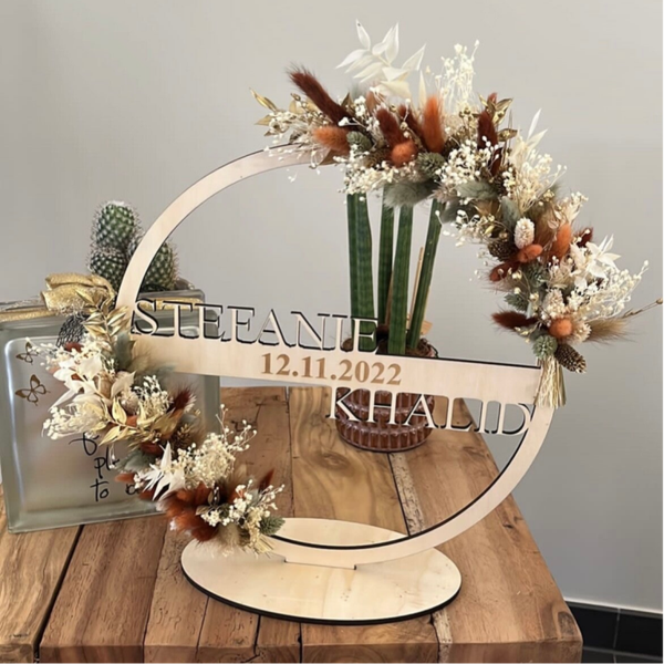 Mooie hoepel met 2 namen en een tekst afgewerkt met droogbloemen.