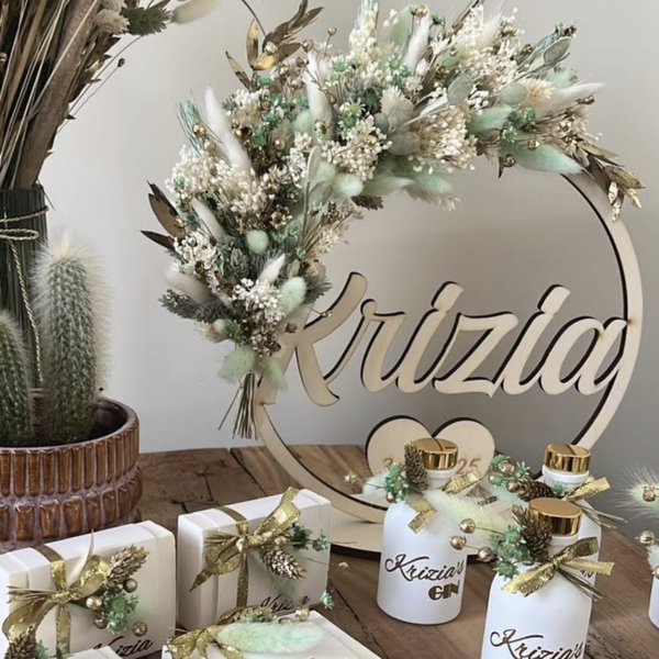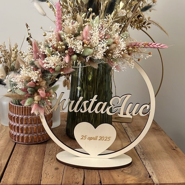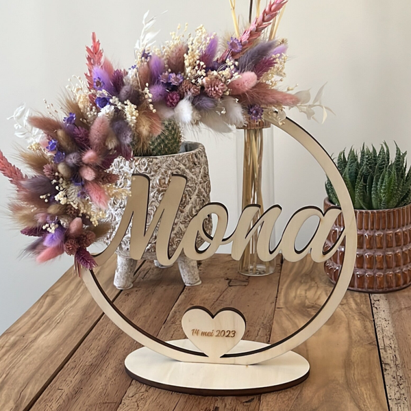 Hoepel met naam en hartje en tekst vanonder afgewerkt met droogbloemen.