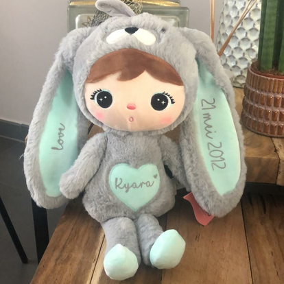 De knuffeltjes kunnen steeds gepersonaliseerd worden naar wens op het buikje of op de oortjes.