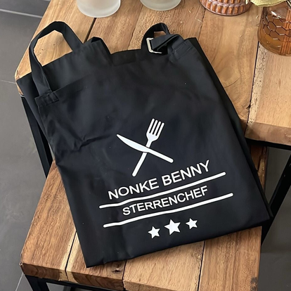 Hoogwaardig schort van TC-materiaal - combinatie van katoen en polyester-. Dubbel voorvak en verstelbare nekbanden. Past onder de knie.