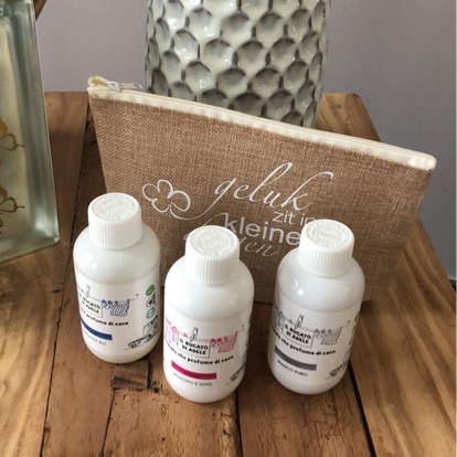 Gratis vilten tasje of wasparfum van 150 ml.