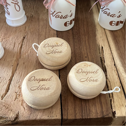 Jojo van gepolijst grenenhout. Met 100 cm, gekrulde katoenen draad in wit.